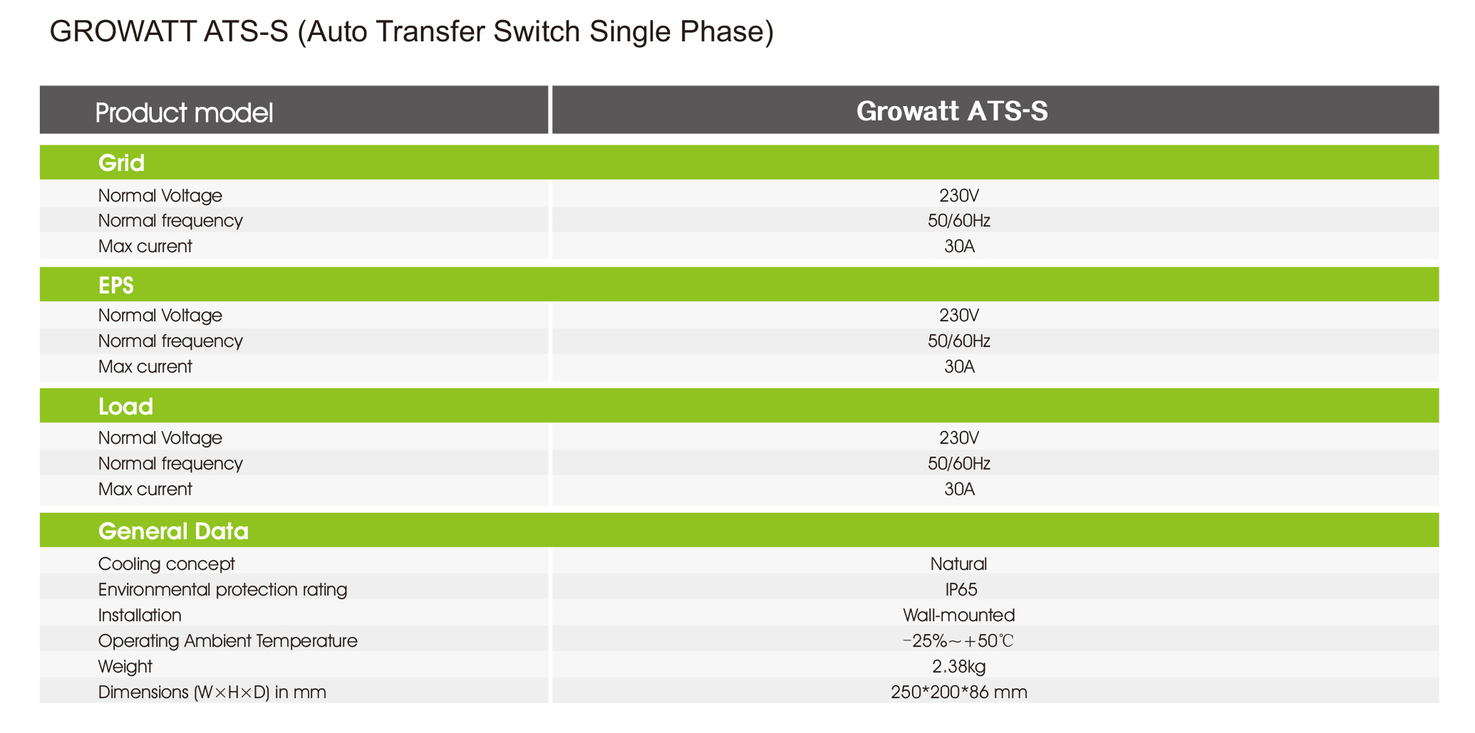 – Growatt ATS-S (Công tắc chuyển đổi tự động một pha) điều khiển việc chuyển đổi các công tắc tơ để cung cấp điện cho tải EPS trong cả điều kiện nối lưới và ngoài lưới.
