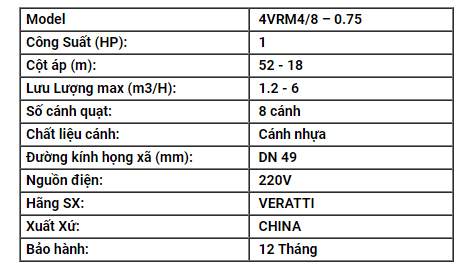 Thông số kỹ thuật bơm hỏa tiễn 4 inch 220v cánh nhựa VERATTI 4VRM4/8 – 0.75:
