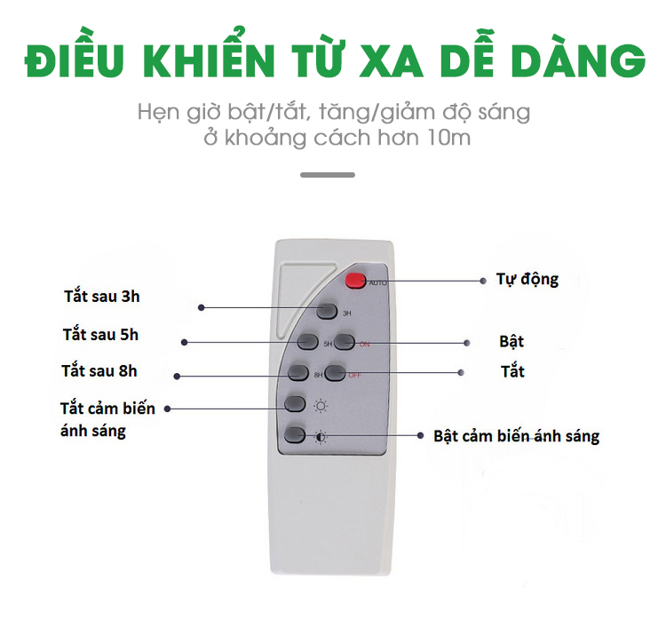 – Tự động bật sáng khi trời tối, tự động tắt khi trời sáng không phải để ý đến thời gian tắt mở hằng ngày.