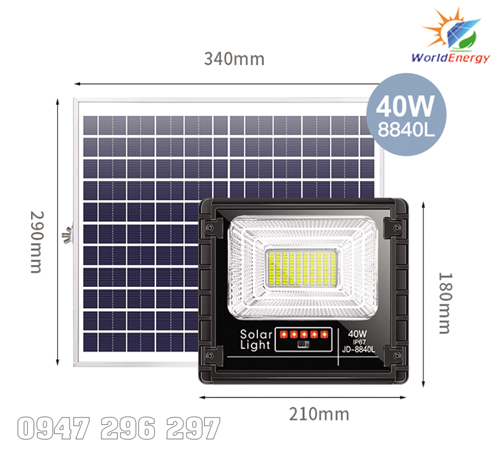 – Mã sản phẩm: JD-8840L– Công suất: 40w– Không gian chiếu sáng: 90m2– LED SMD 5730: 110led.– Chiếu sáng liên tục: 10-12h đồng hồ– Thân đèn: Nhôm sơn tĩnh điện, có rãnh tản nhiệt.– Mức độ bảo vệ: IP67– Kích thước đèn: 220x 255 x 45mm– Kích thước tấm pin: 340 x 290 x 17cm– Công suất tấm pin năng lượng: 6v/18w. Tuổi thọ 10-12 năm– Dung lượng pin: 12.800maH.– Thời gian sạc: 4-6h nắng tiêu chuẩn– Bảo hành: 2 năm |