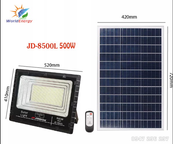 – Mã sản phẩm: JD-8500L– Công suất: 500w– LED SMD 5730: 806led.– Diện tích chiếu sáng: 600m² – Chiếu sáng liên tục: 10-12h đồng hồ– Thân đèn: Nhôm sơn tĩnh điện, có rãnh tản nhiệt.– Mức độ bảo vệ: IP67– Kích thước đèn: 520 x 410 x 90mm– Kích thước tấm pin: 720 x 420 x 30mm– Công suất tấm pin năng lượng: 6v/75w. Tuổi thọ 10-12 năm– Dung lượng pin: 60.000maH.– Thời gian sạc: 4-6h nắng tiêu chuẩn– Bảo hành: 2 năm |